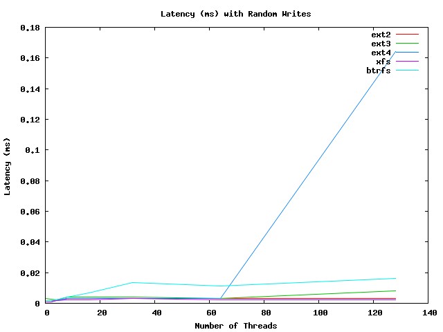 With random writes the latency is consistently flat, apart from the final data point for ext4 at 128 threads which could be just due to an anomaly.