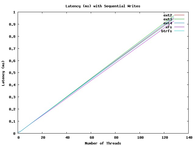 Again the linear scaling with latency as thread count increases with very similar performance between all file systems. In this case, btrfs performs best.