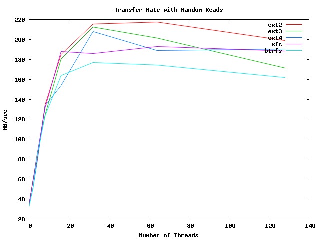 So which file system performs best on the SSD? Well, it depends on the use case. There are may different file system benchmarking tools available and each one addresses different types of file system behaviour. Which ever test I use it most probably won't match your use case(!) Since SSDs have very small latency overhead it is worth exercising various file systems with multiple threaded I/O read/writes and see how well these perform. I rigged up the threaded I/O benchmarking tool tiobench to exercise ext2, ext3, ext4, xfs and btrfs while varying the number of threads from 1 to 128 in powers of 2. In theory the SSD can do multiple random seeks very efficiently, so this type of testing should show the point where the SSD has optimal performance with multiple I/O requests.